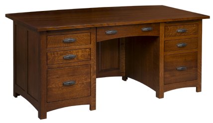 Desk features a 6" overhang on back side, keyboard drawer, double pedestals with 2 file drawers and 4 storage drawers. 1" solid top and 25.5" wide knee area.